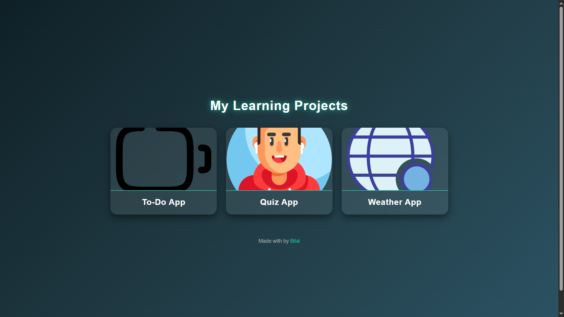 My personal portfolio with three fully functional React applications To-Do App, Quiz App, and Weather App. All apps are built with React.js, styled using Tailwind CSS, and integrated with React Router for smooth navigation. The design is fully responsive and modern.