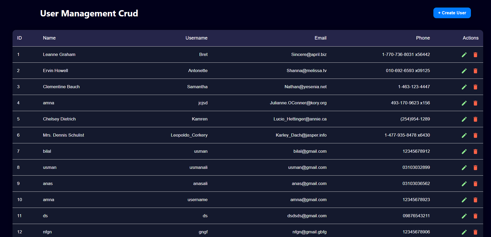 A fully functional React User Management CRUD Application built using React.js and Axios with live API integration from MockAPI.io. Users can create, read, update, and delete records dynamically. The app uses Material UI (MUI) for a clean and responsive interface and React Router for page navigation.